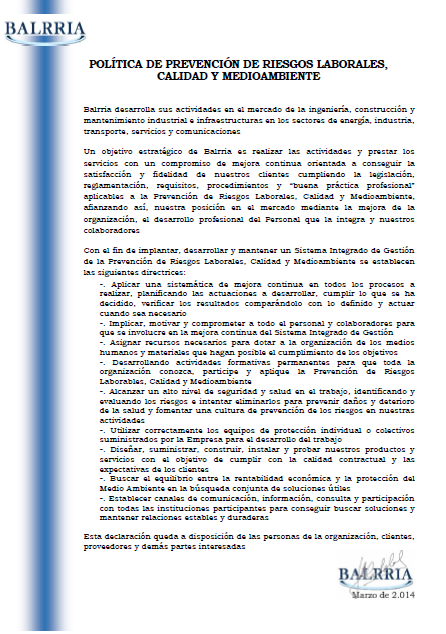 Un objetivo estrategico de Balrria es realizar las actividades y prestar los servicios con un compromiso de mejora continua orientada a conseguir la satisfaccion y fidelidad de nuestros clientes cumpliendo la legislacion, reglamentacion, requisitos, procedimientos y "buena practica profesional" aplicables a la Prevencion de Riesgos, Calidad y Medioambiente, afianzando así, nuestra posicion en el mercado mediante la mejora de la organizacion, el desarrollo profesional del Personal que integra y nuestros colaboradores.